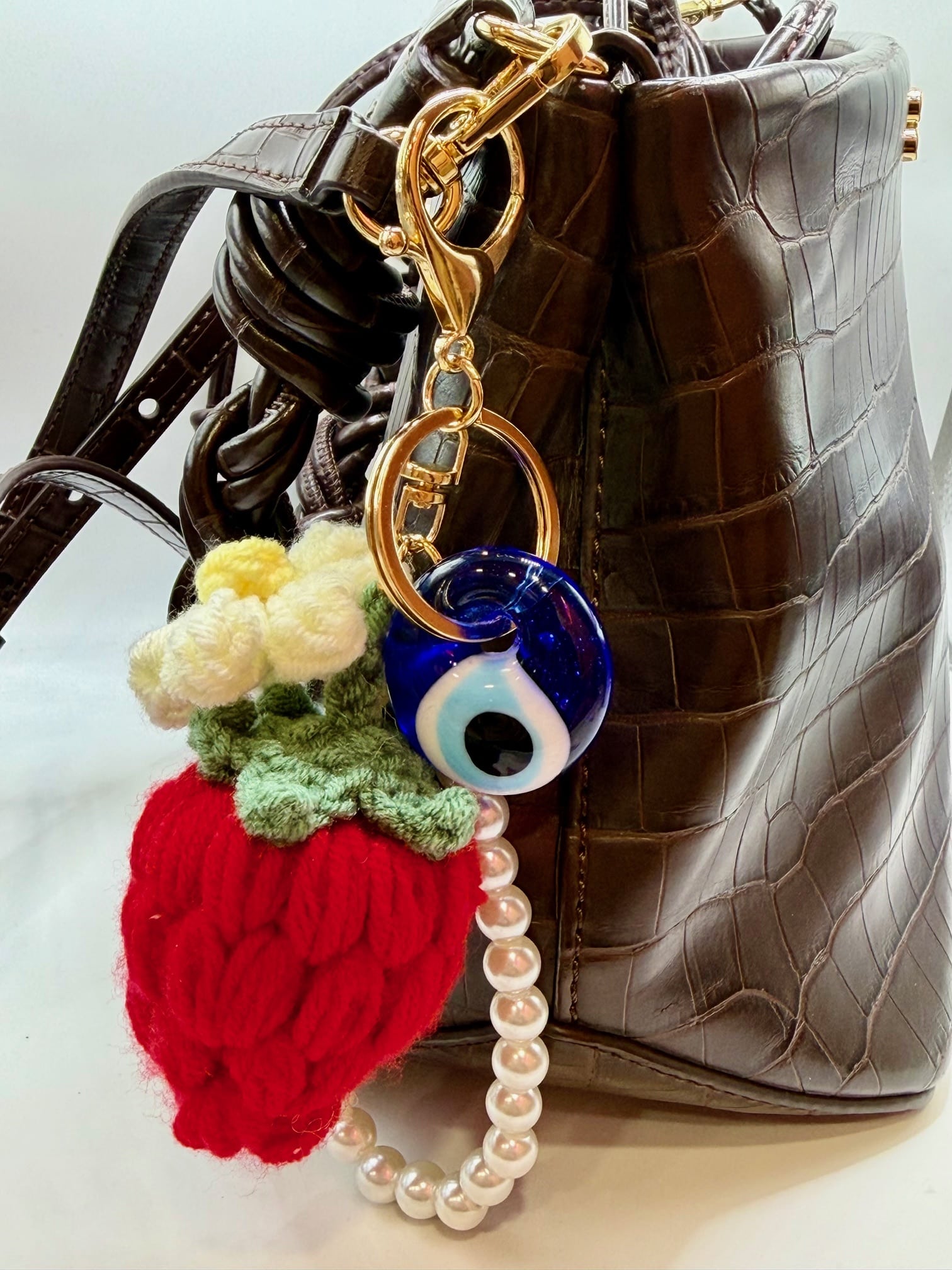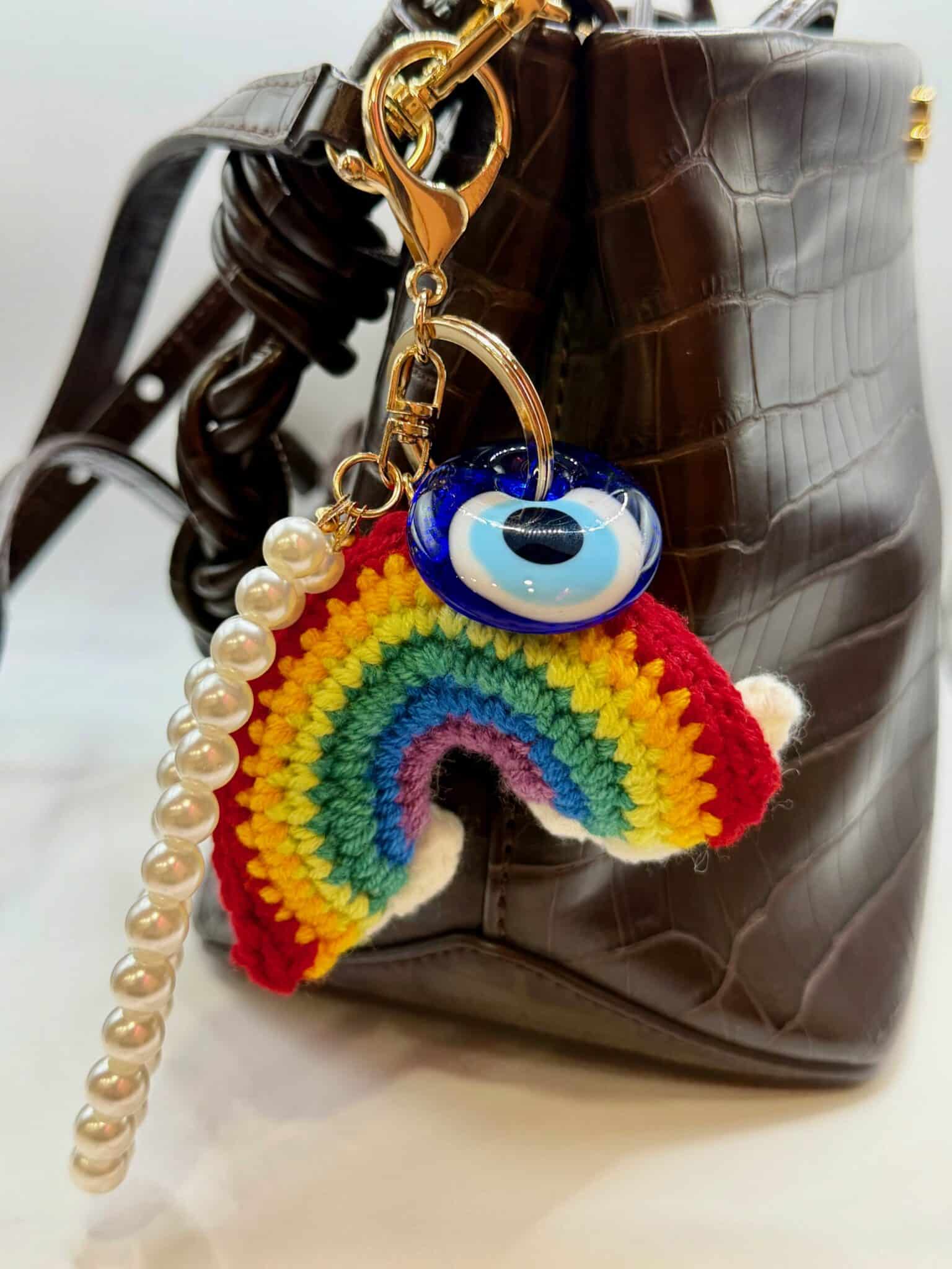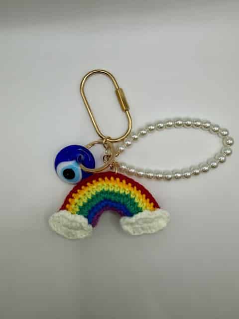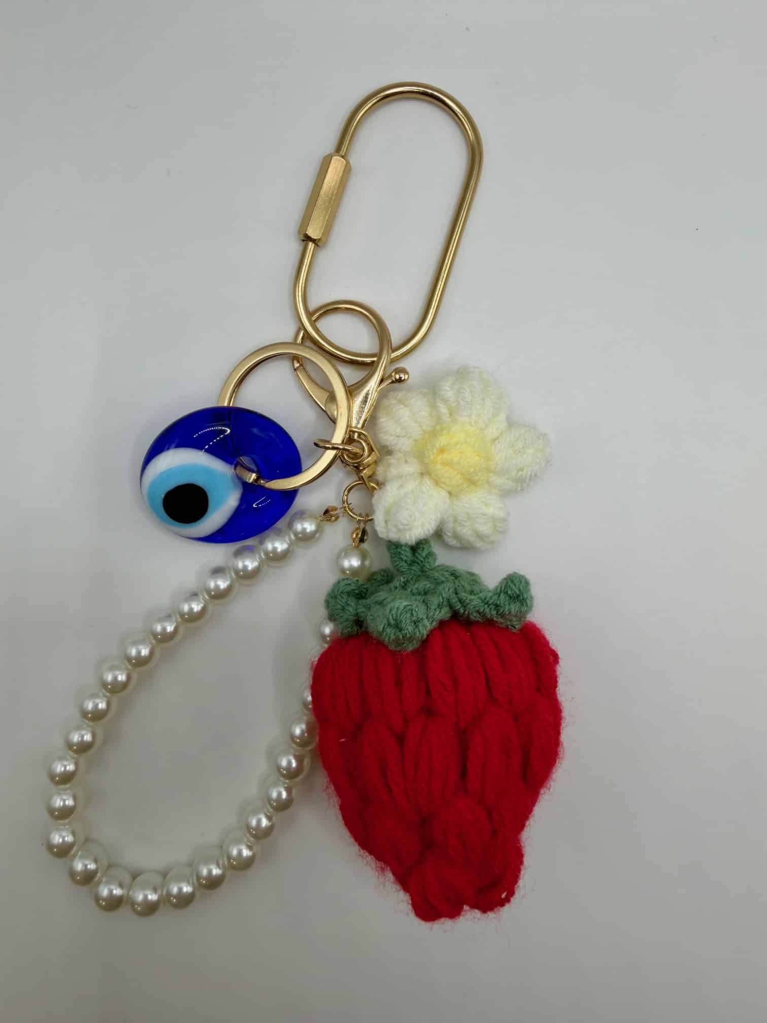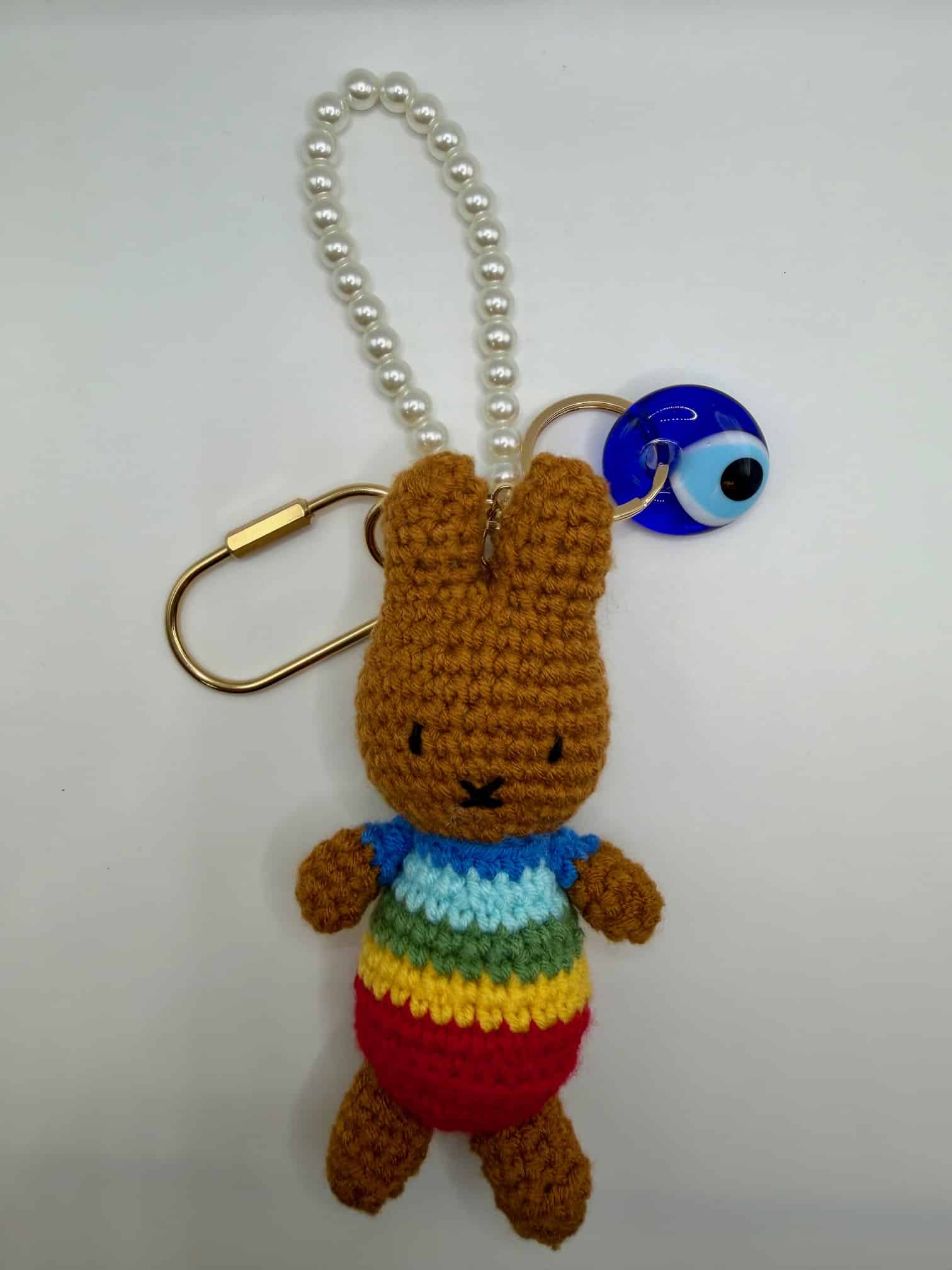 Muni d’un anneau porte clé, d’un petit mousqueton et d’un grand mousqueton, il peut s’accrocher à vos sacs de ville, vos paniers……et il vous protège avec son nazar en verre.