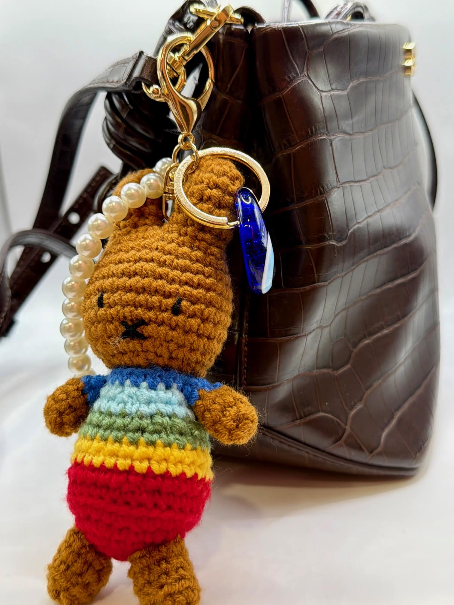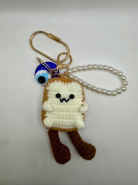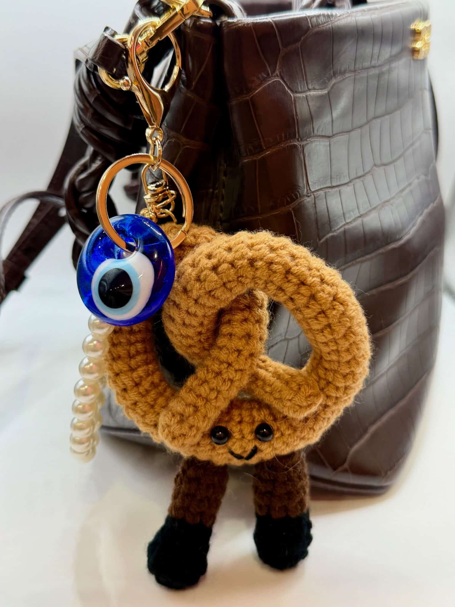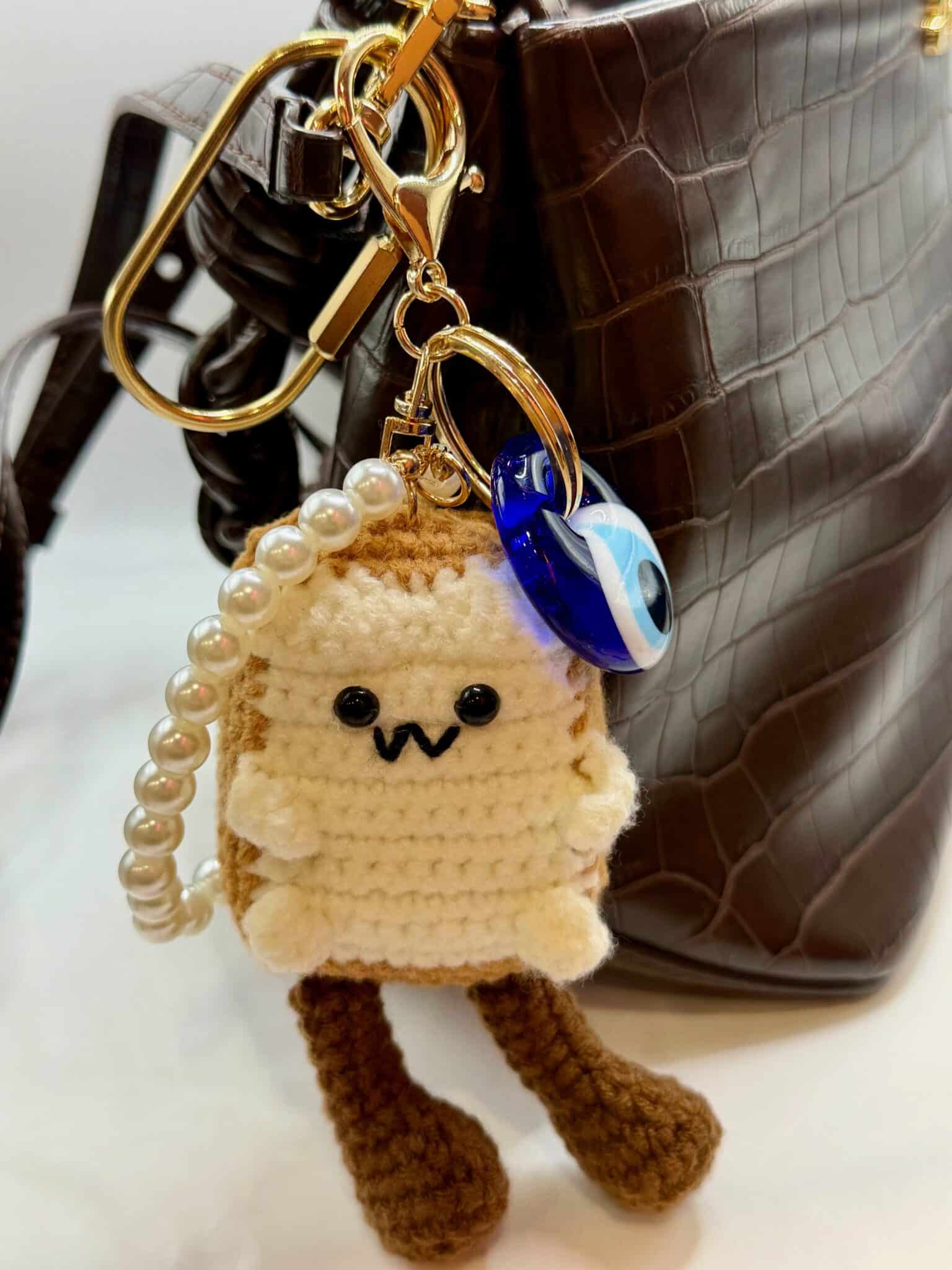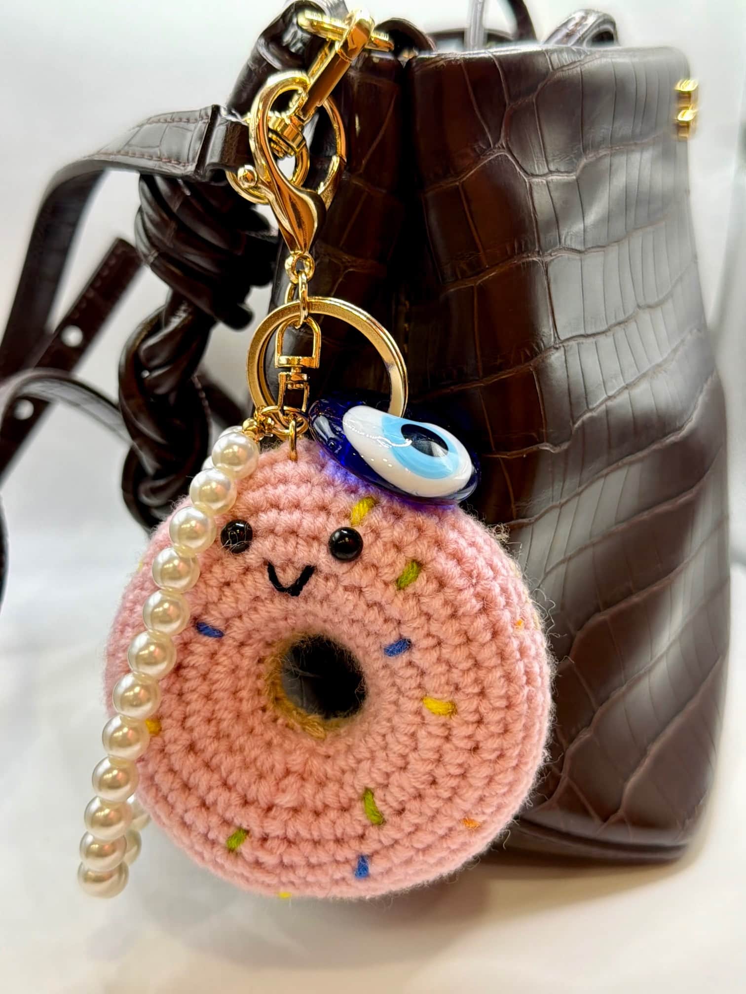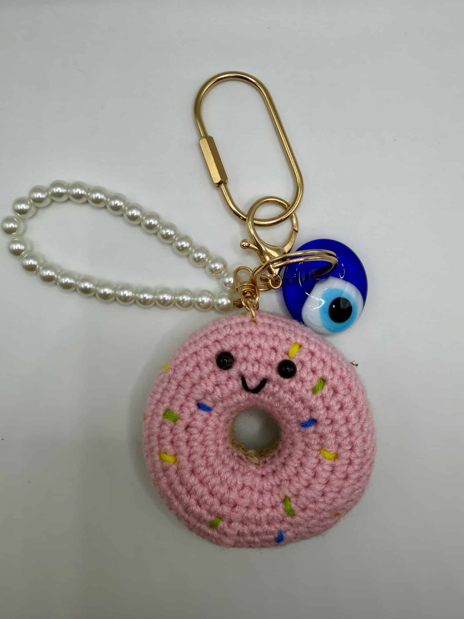 Muni d’un anneau porte clé, d’un petit mousqueton et d’un grand mousqueton, il peut s’accrocher à vos sacs de ville, vos paniers……et il vous protège avec son nazar en verre.